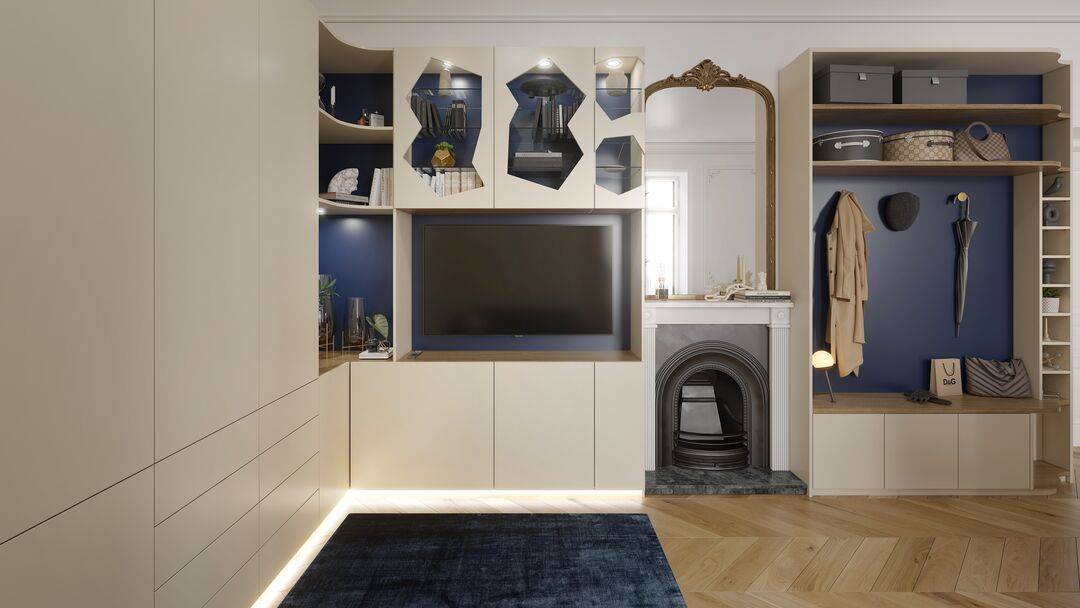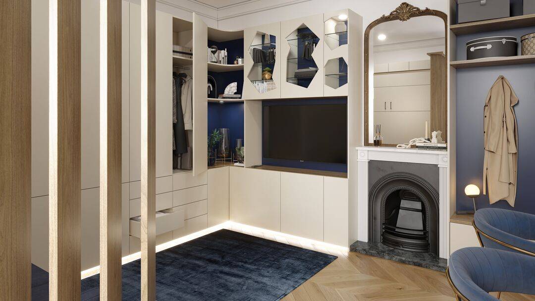 Le fait de créer un ensemble de meubles sur mesure, servant à la fois de meuble TV, de placards pour les vêtements et de meuble d'entrée permet de gagner un important volume de rangement. La continuité dans les couleurs et le style apportent la touche Quadro.