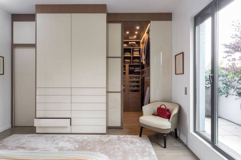 avec une porte coulissante remplie de panneaux en verre laqué crée une séparation entre la chambre et le dressing tout en étant assortie aux aménagements.