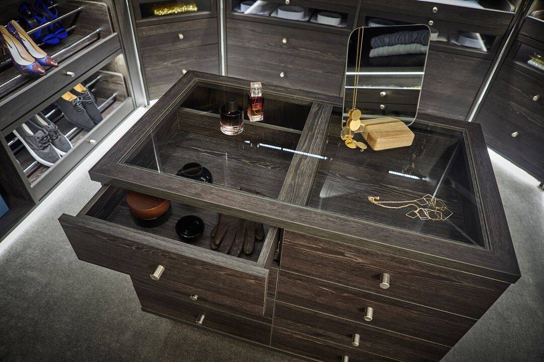 Ce dressing sur mesure avec son podium permet non seulement d'organiser le rangement des vêtements mais constitue également une pièce de standing dans la maison.