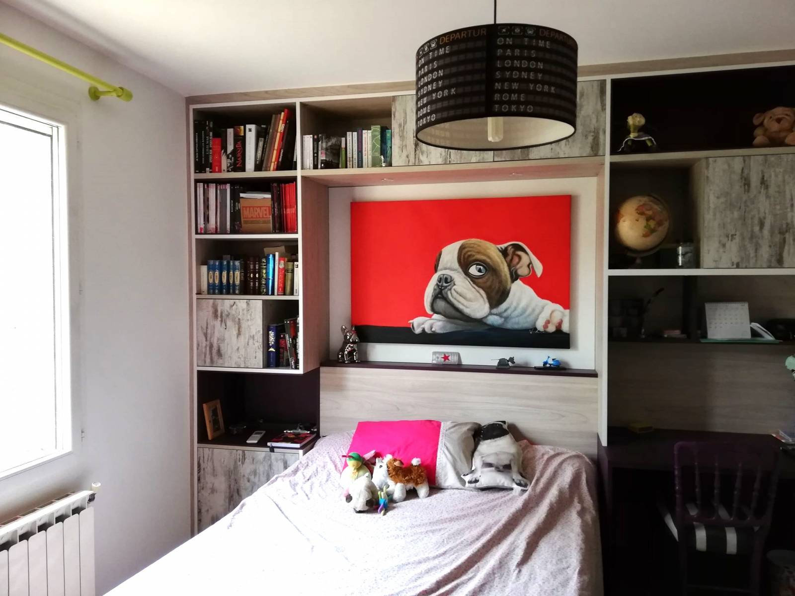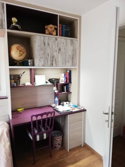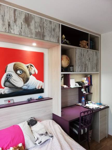 Le lit est encadré de manière astucieuse pour maximiser les rangements en hauteur et sur les coté, un véritable gain de place. Pour harmoniser l'ensemble nous avons créé une tête lit qui se fond dans la composition sur mesure. Le bureau est un véritable cocon propice aux moments studieux. La commode équipée de tiroirs pousse lâche, offre un maximum de rangements pour les vêtements