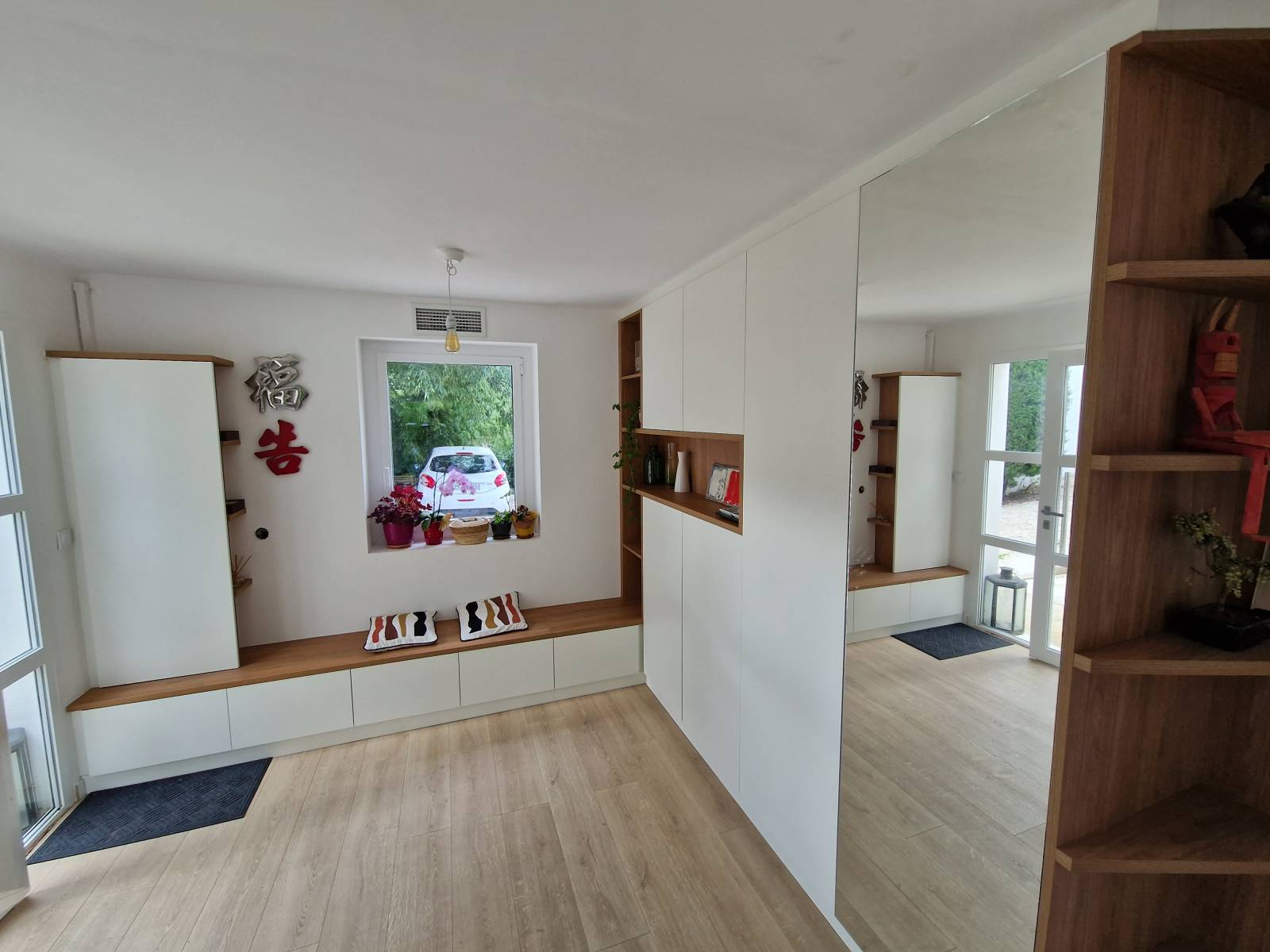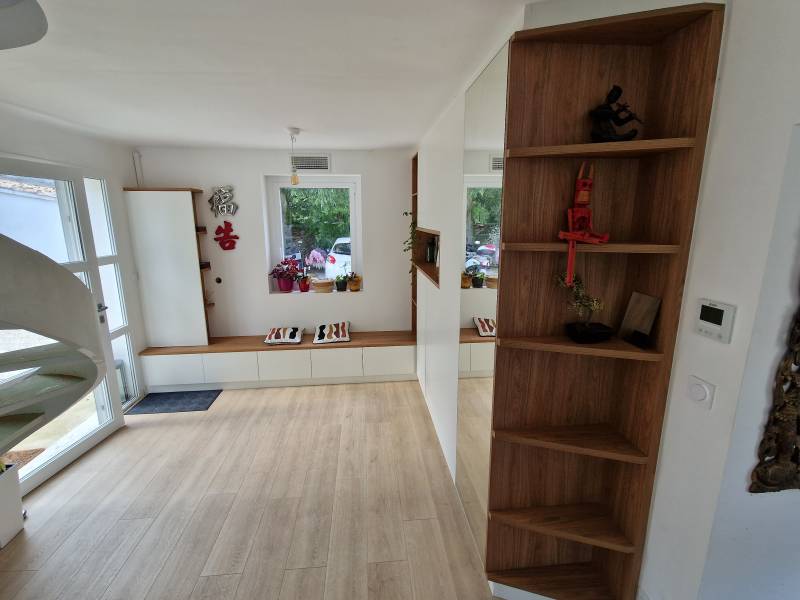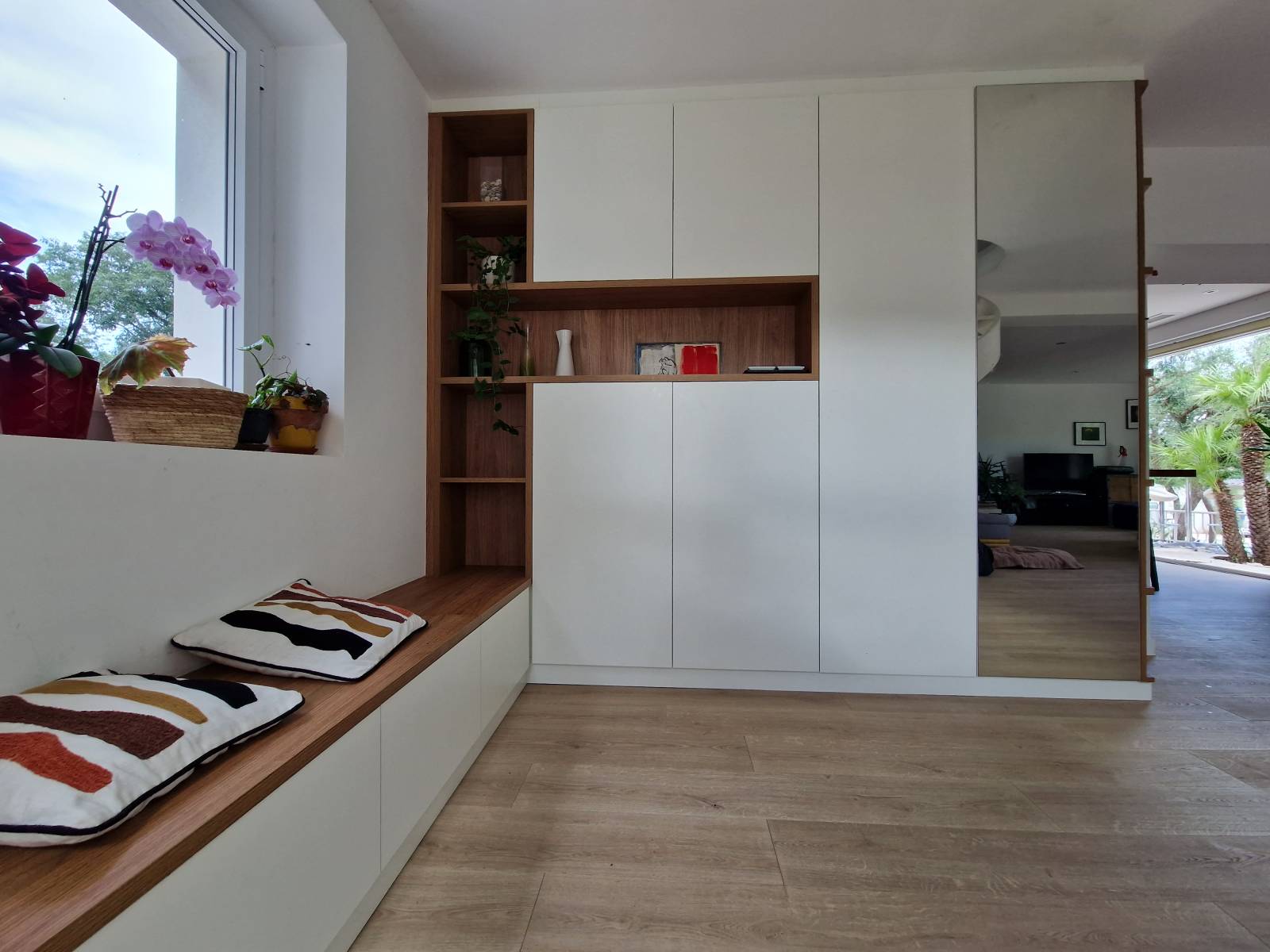 L'angle formé par la jonction entre la banquette et la grand armoire a été pensé avec un aménagement type bibliothèque décor bois pour apporter la touche déco de l'entrée