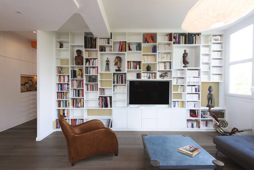 Nous avons aménagé dans cette pièce à vivre une bibliothèque contemporaine sur mesure, à la fois décorative et pratique. Ce meuble sur mesure met en valeur des objets d’art dans des niches dimensionnées à cet effet et intègre également la télévision de manière discrète