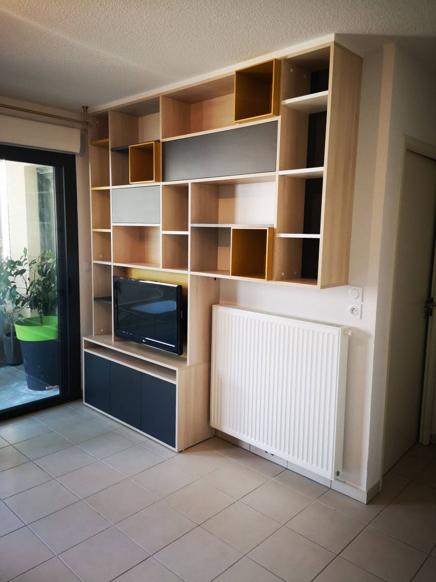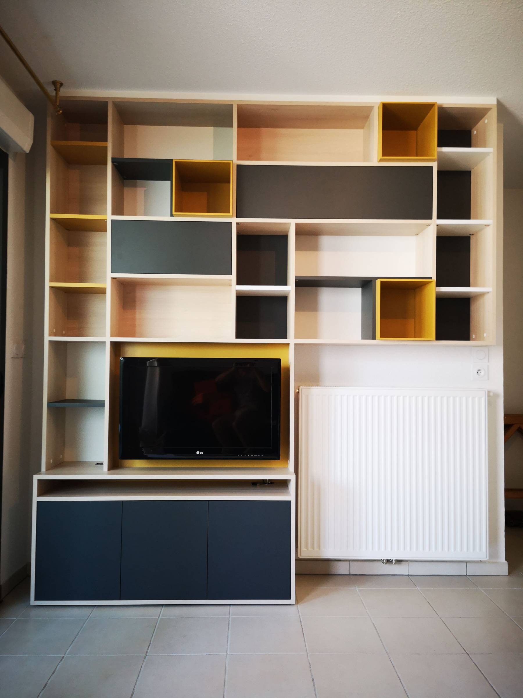 La partie bibliothèque au dessus du radiateur a été suspendue pour plus de légèreté visuelle. Cette bibliothèque aux lignes contemporaines est équipée de grandes portes relevantes pour du rangement ainsi que de niches colorées pour mettre en valeur des objets déco . Les différentes hauteurs d'étagères permettent de ranger des livres de formats différents et créé un rythme asymétrique.