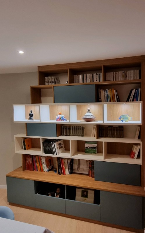 Cette bibliothèque moderne a été conçue sur un jeu de lignes horizontales. Les différentes hauteurs d'étagères en saillie sur les côtés amènent l'effet déstructuré Des espaces pour les objets décoratifs éclairés par des spots ont été créés. Des portes qui coulissent sur la largeur du meuble permettent de masquer ponctuellement certaines parties. Les tiroirs du meuble bas ont été aménagés pour ranger une collection de vinyles. Le mélange de couleur tendance donne de la vie à cette bibliothèque qui trouve sa place au milieu du salon!