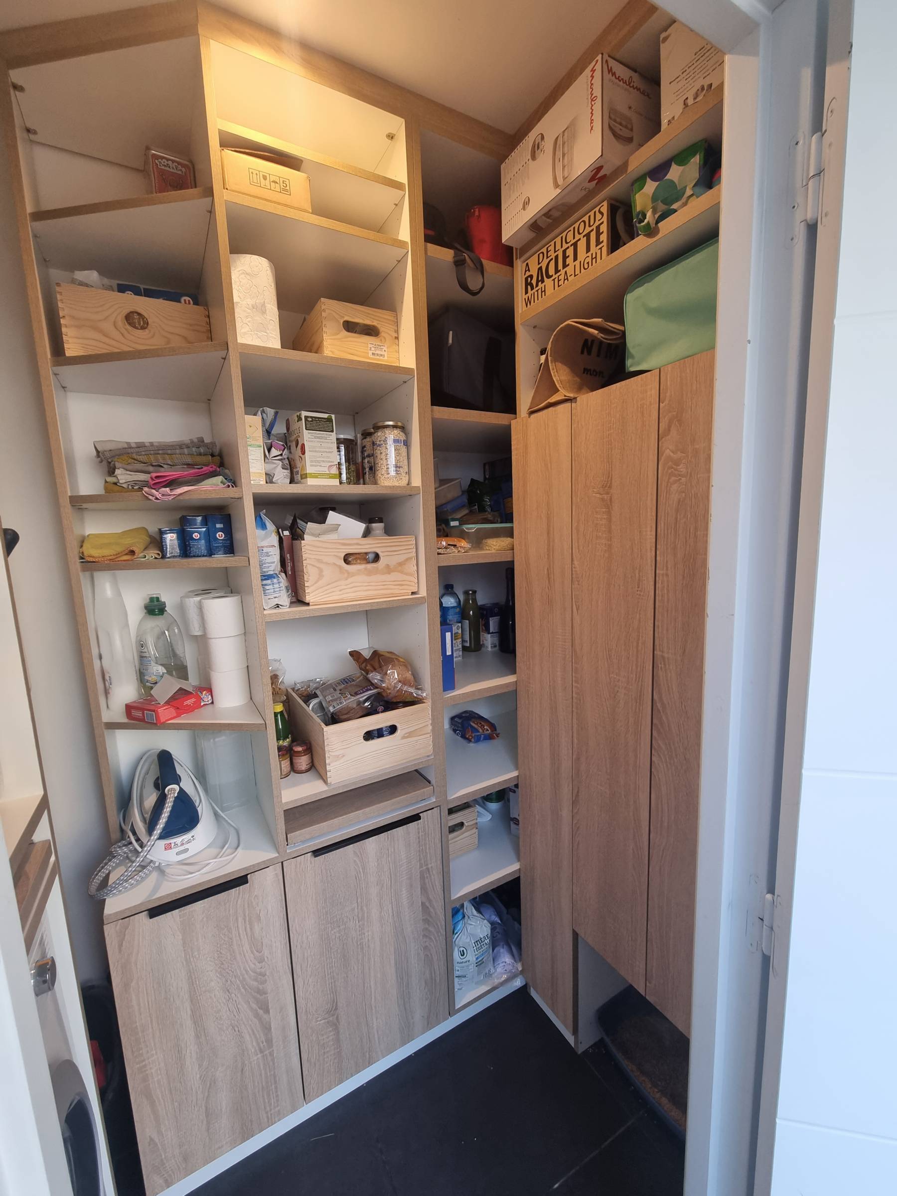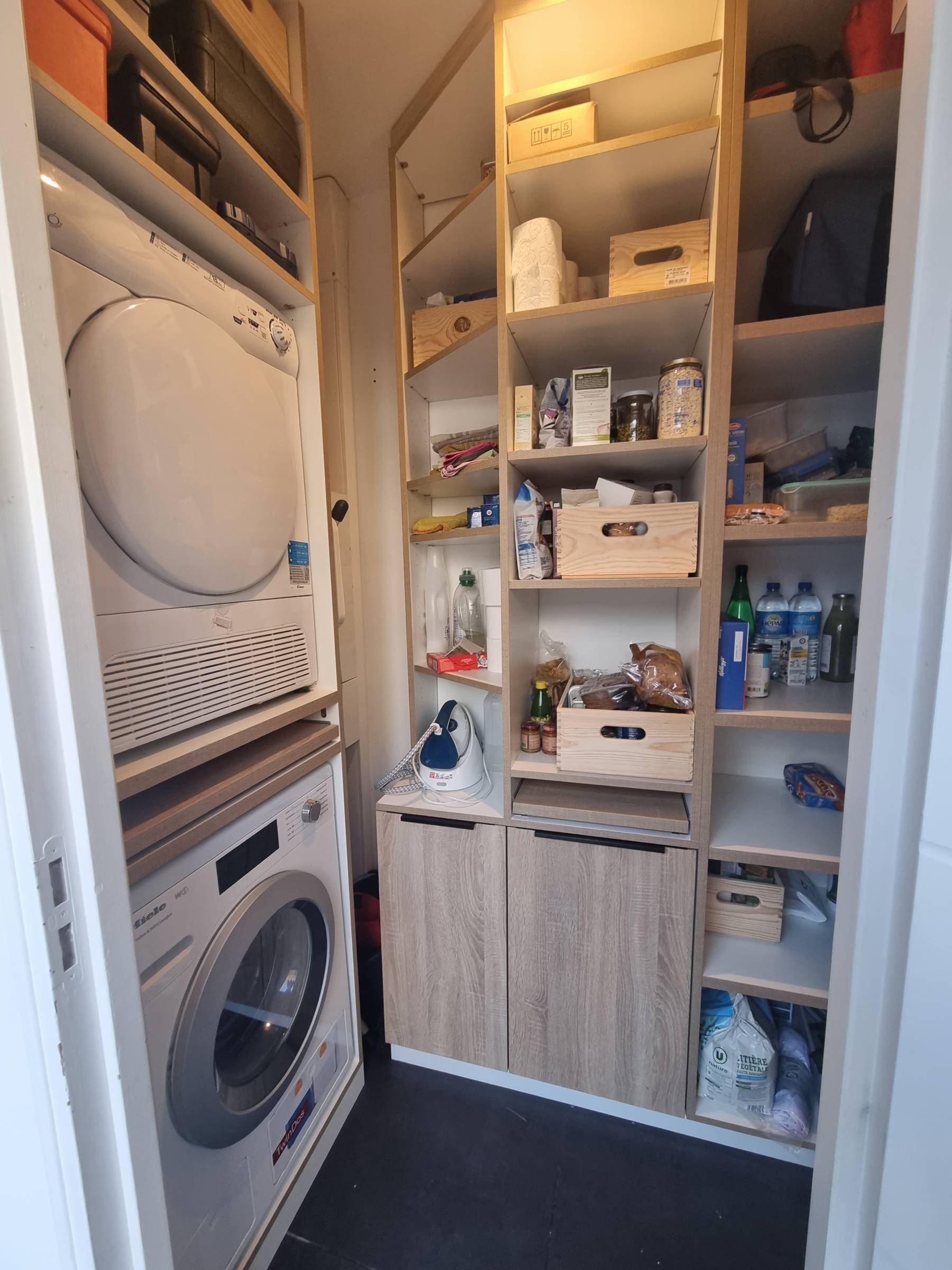 La buanderie auparavant délaissée dans la maison est une pièce désormais importante. Grâce aux nombreuses solutions de nos meubles sur mesure, la buanderie s'agrandit sans pousser les murs! En superposant les machines avec entre les deux des tablettes coulissantes pour poser le bac à linge. A l'arrière des portes se cache une panière à linge escamotable pour le linge sale. Les meubles pan coupé laissent l'accès au tableau électrique. Même la litière du chat trouve sa place!