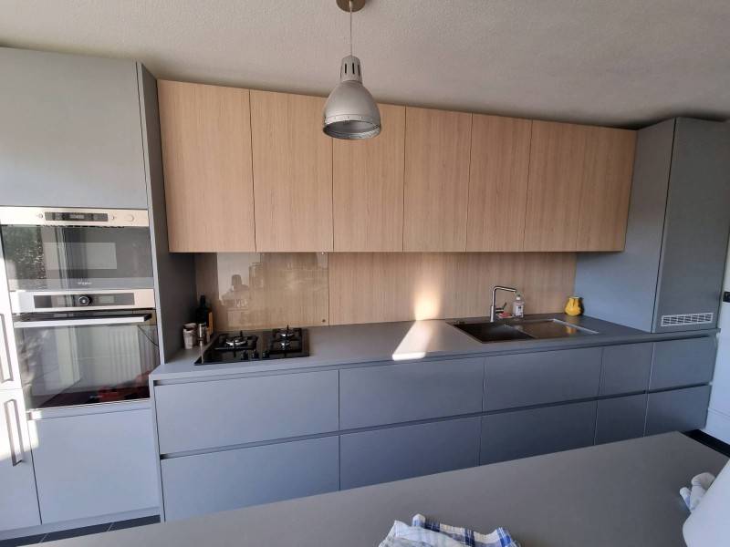La rénovation complète de cette cuisine dans un appartement à Nîmes a été entièrement réalisée par nos équipes. L'ancienne cuisine a été démontée et évacuée par nos poseurs, laissant place à une nouvelle cuisine sans poignées au design épuré. La plomberie et l'électricité ont été refaites aux normes sous nos instructions.