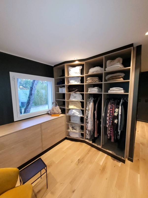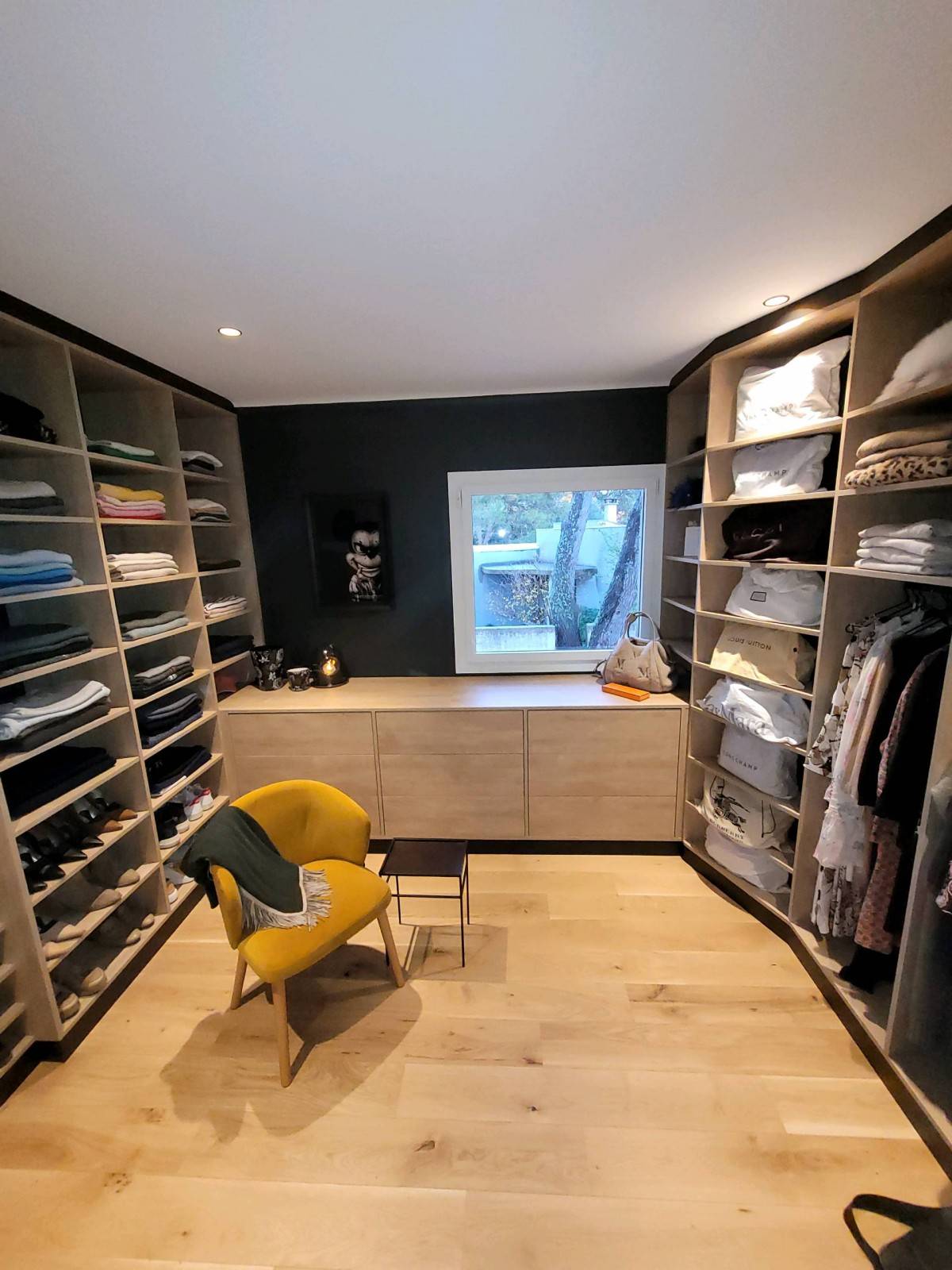 Dans cette pièce dédiée exclusivement au rangement des vêtements, chaque détail a été minutieusement pensé. De nombreux tiroirs ont été prévus pour remplacer une ancienne commode, tandis qu'un meuble spécialement conçu pour les chaussures et des penderies pour les chemises ajoutent une touche de praticité.