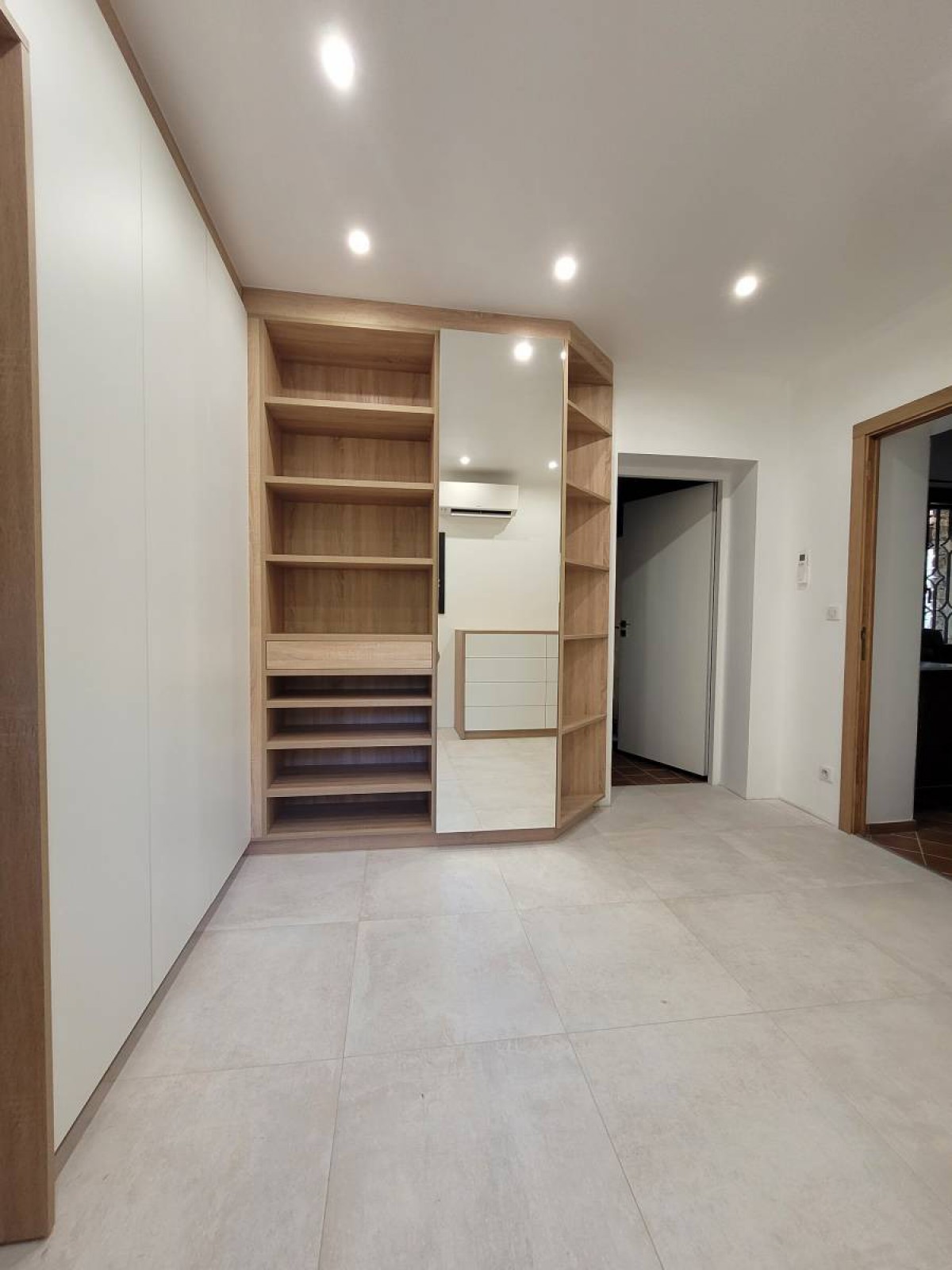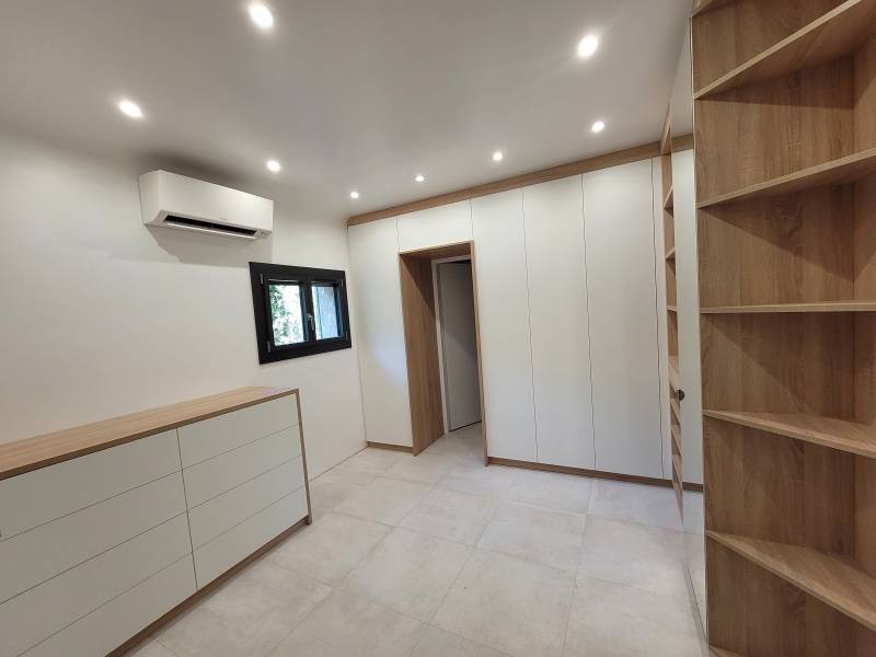 Les meubles sont équipés principalement de penderies, d'étagères . Une commode sur mesure équipe la pièce de grands tiroirs, permettant un rangement à la fois optimisé et pratique. Les penderies offrent un rangement soigneux, sans froisser les habits.