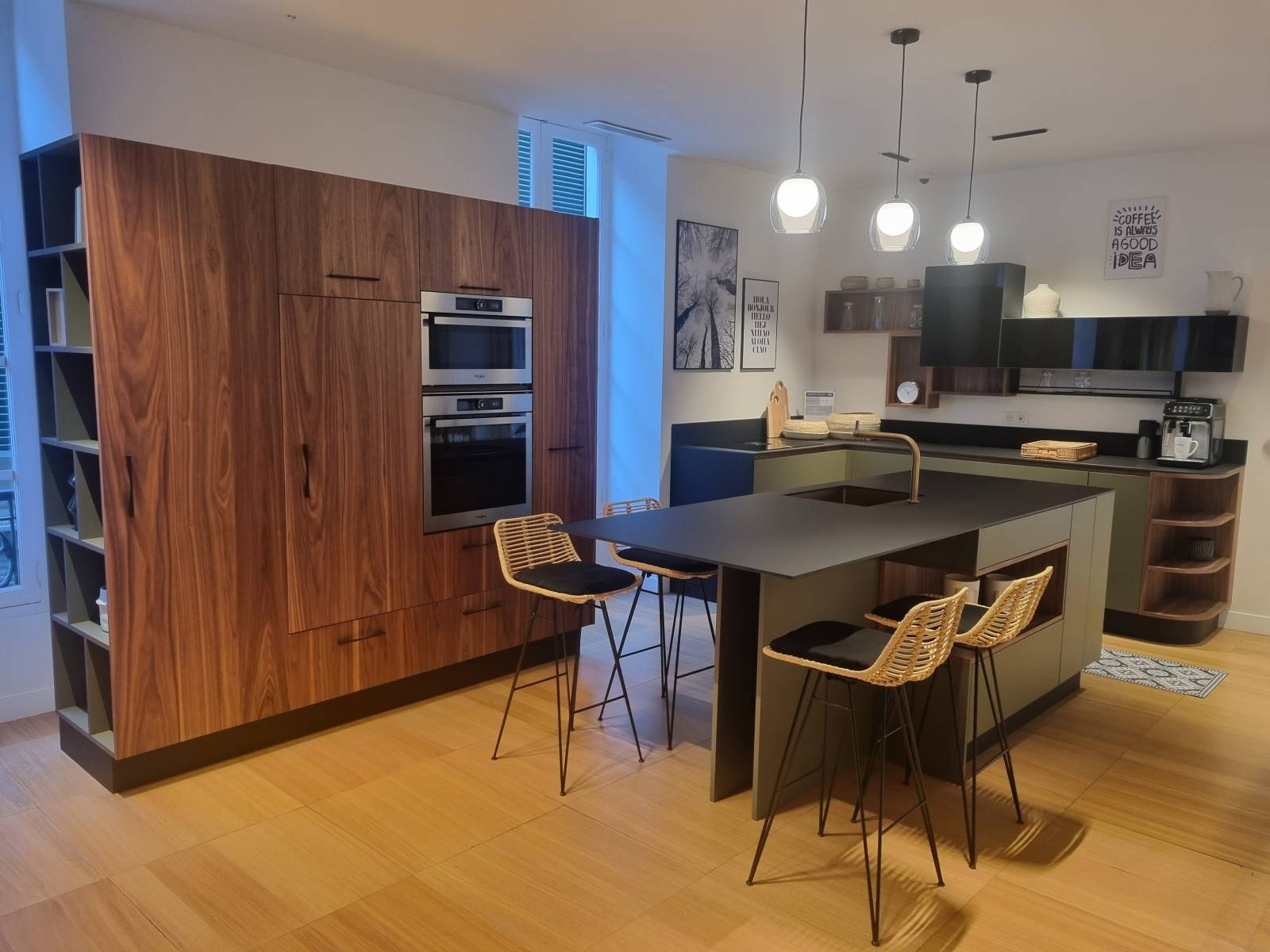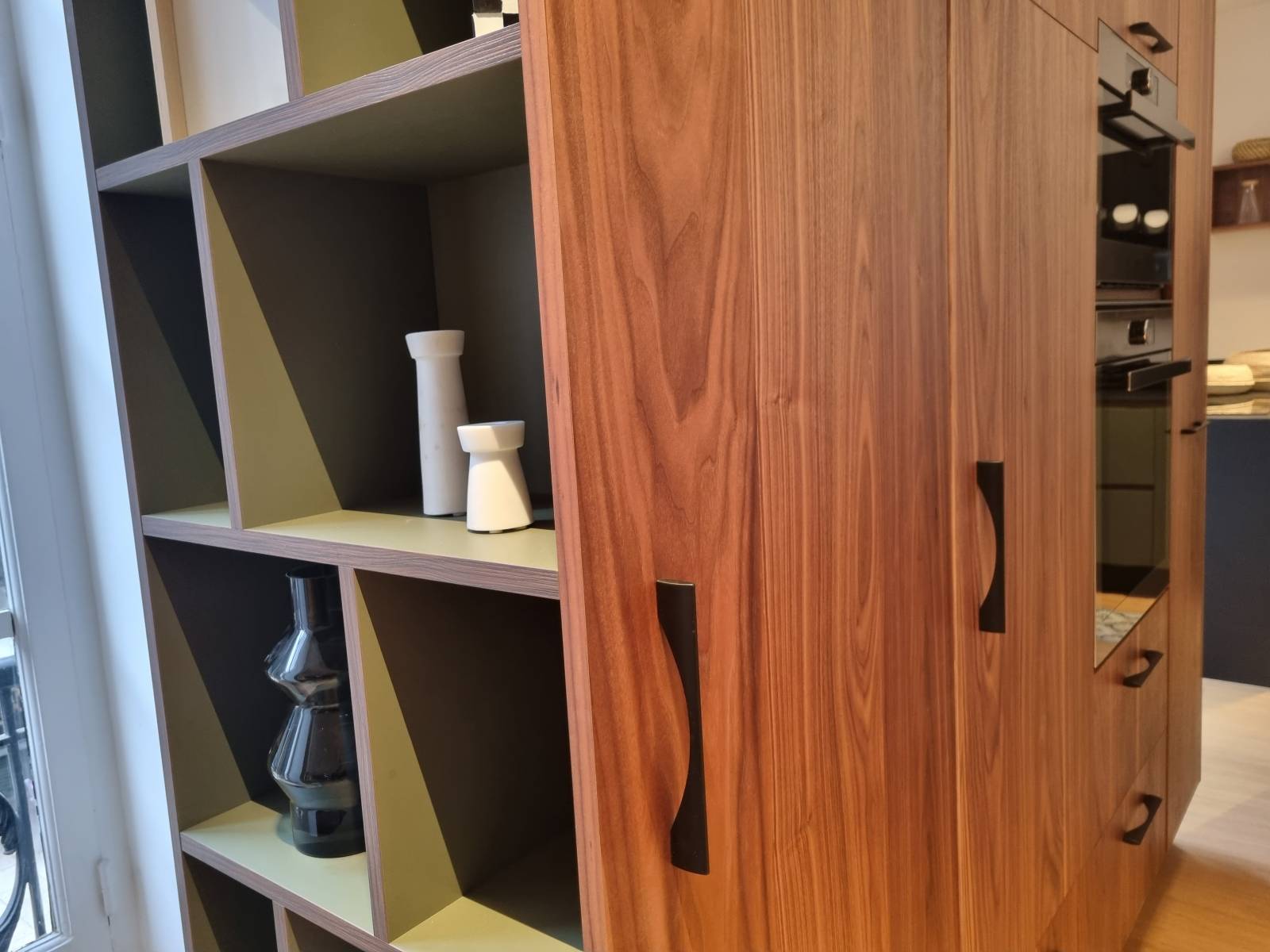 L'ensemble de colonnes recevant les fours, un réfrigérateur intégré, et réalisé en placage noyer qui amène le coté chaleureux du bois. L'aménagement de bibliothèque latéral permet de créer une transition originale vers le salon. Les cuisines étant le plus souvent ouverte, une cohérence avec le reste de la maison est primordiale !