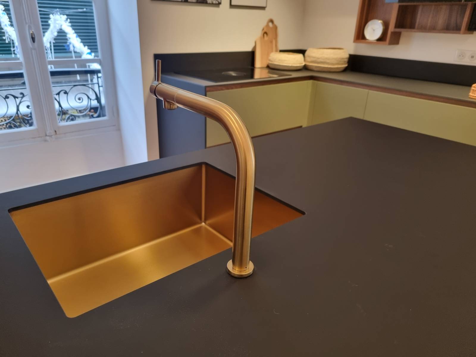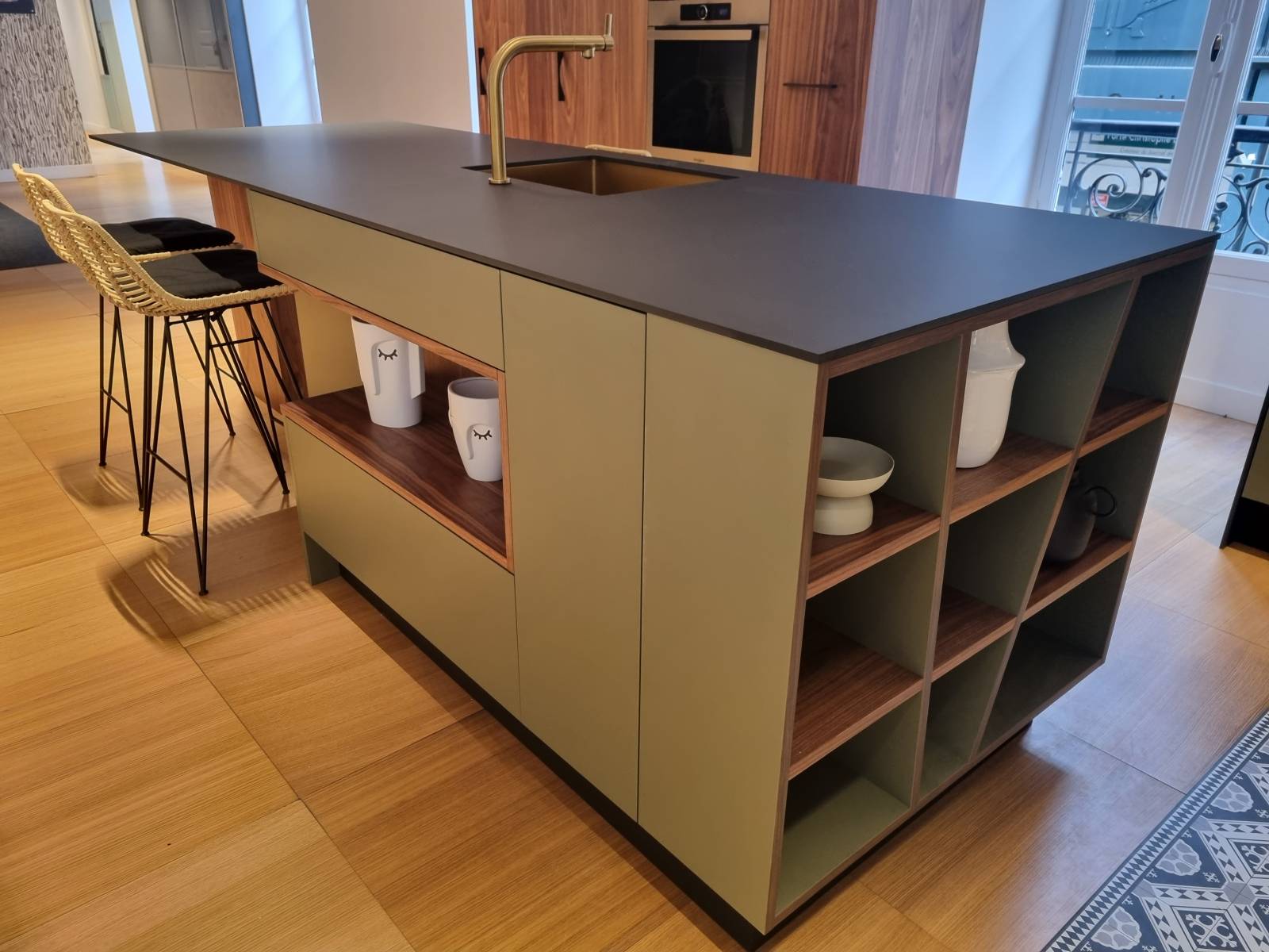 L'ilot qui constitue la pièce maitresse, est un espace de convivialité avec sa cuve sous plan et son espace repas pour 5 personnes. Le plan de travail est traité en compact ultra mat pour plus de finesse.