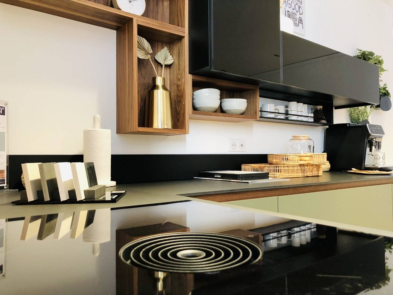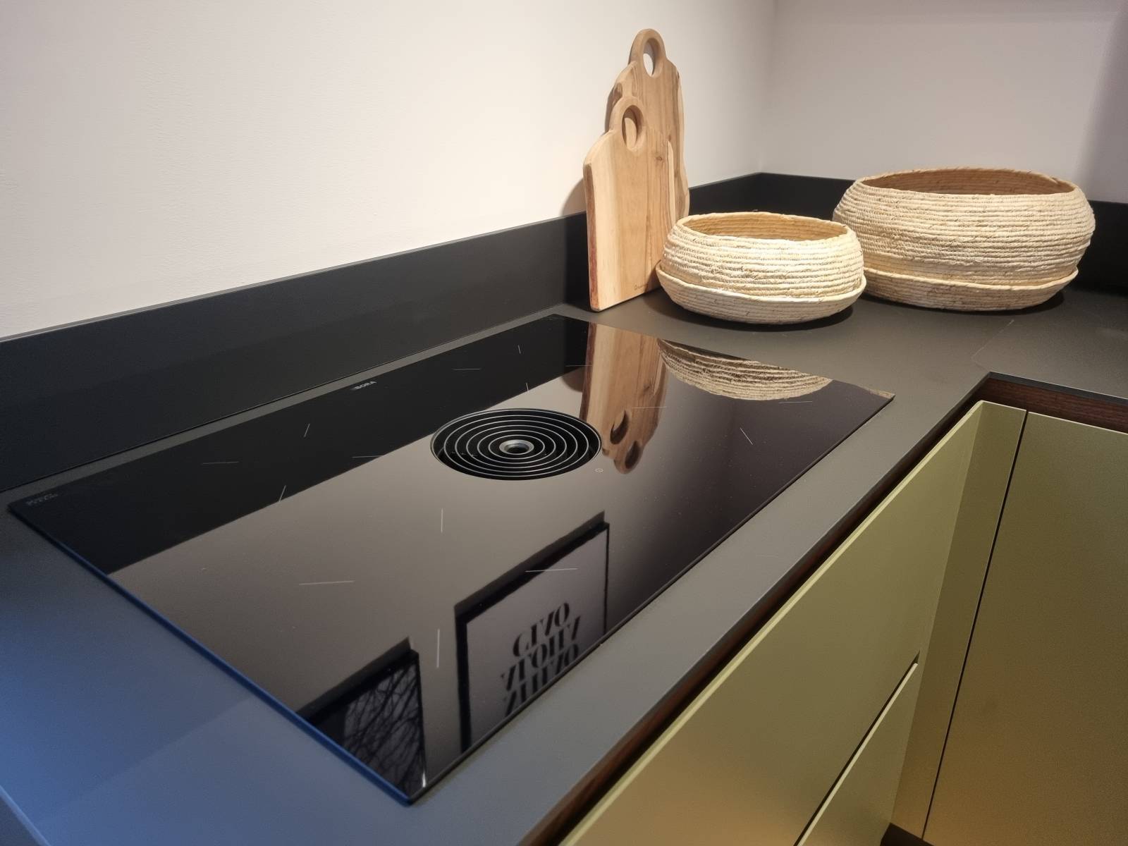 Le linéaire de cuisson ou est positionnée la plaque avec hotte intégrée, est conçu sans poignées, permettant ainsi un jeu de couleur supplémentaire.