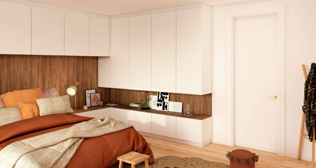 La création d'un aménagement sur mesure nous permet de combiner à la fois, une tête de lit, un espace chevet intégré et les rangements dans des placards fermés