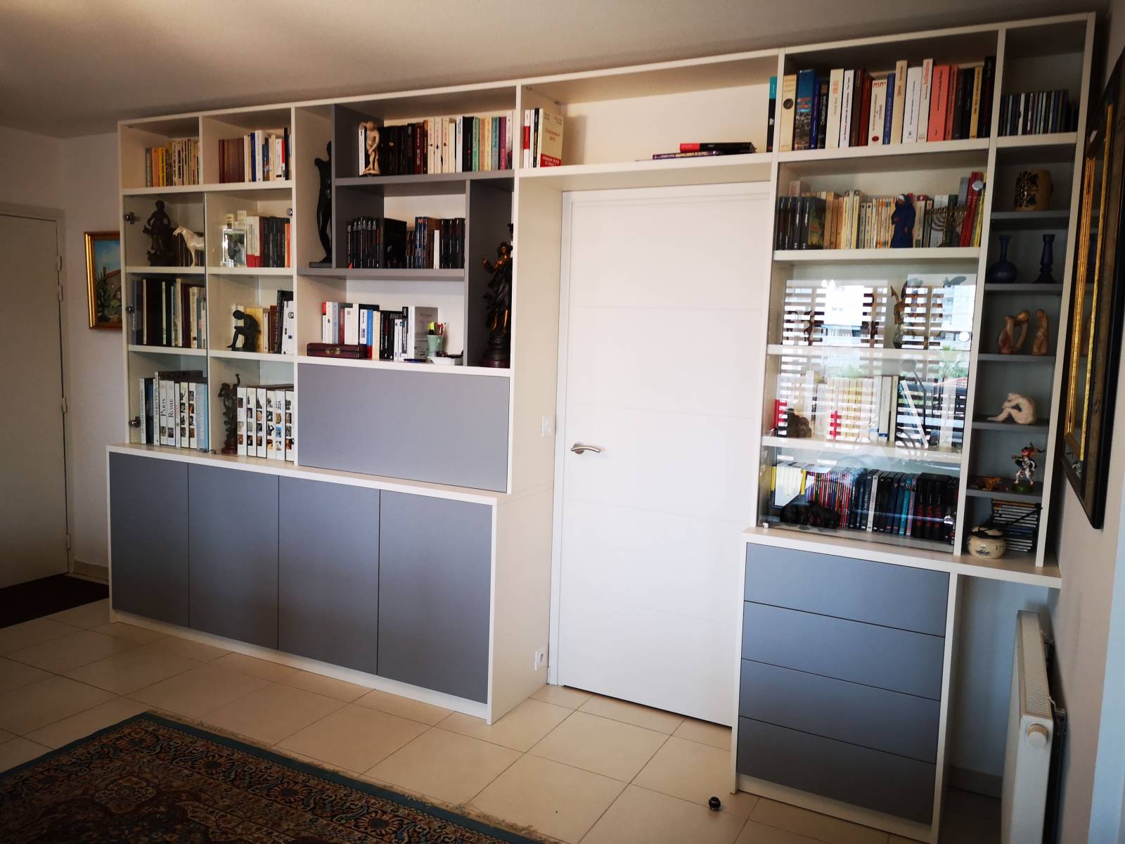 Des lignes simples avec pour objectif d'encadrer la porte tout en prenant en compte la contrainte technique du radiateur. Les hauteurs d'étagères ont été calculées pour optimiser et mettre en valeur les collections de livres.Le meuble dispose de nombreux rangements notamment grâce à ses portes battantes en partie basse ainsi que ses tiroirs. Un abattant dissimule un bar avec les bouteilles ainsi qu'un système pour ranger les verres. Une vitrine vient fermer les collections de livres d'or. Les façades du meuble ont été laquées pour reprendre une couleur existante dans le salon.