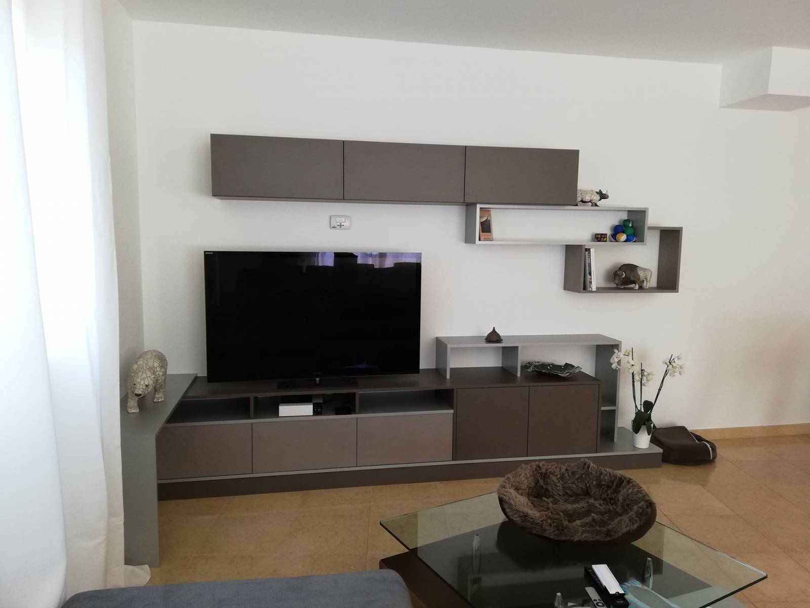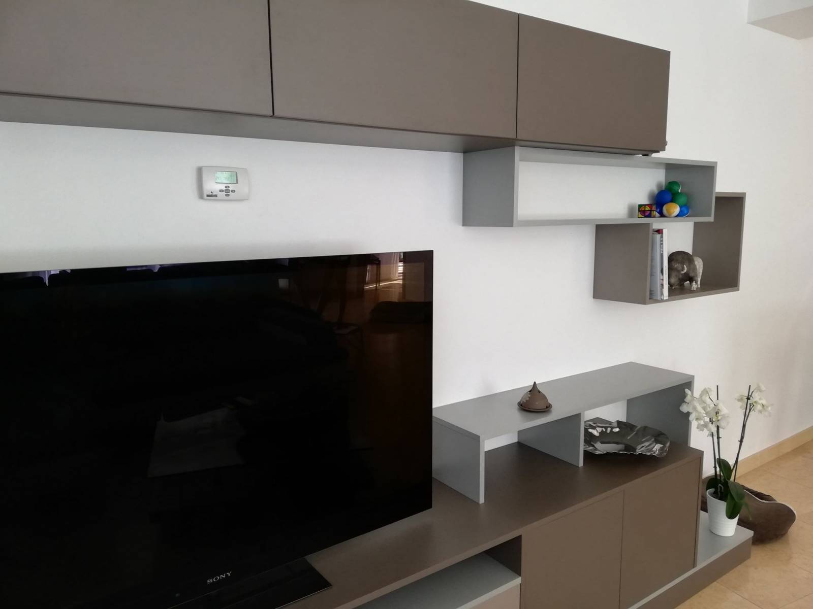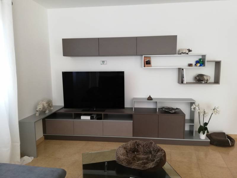 Ce meuble TV permet non seulement d'intégrer des éléments tels que la boxinternet ou lui encore le lecteurDVD, il permet également de ranger des album photo grâce à ses tiroirs et ses rangements dissimulés derrière les portes Le meuble joue avec les lignes de la télévision, avec une partie haute suspendue et des niches décoratives. Le plancher qui déborde sur la droite permet de placer un vase.