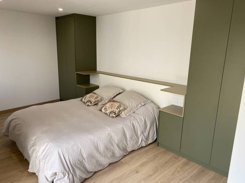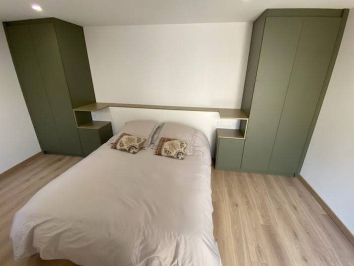 Une tête de lit sur mesure personnalisée ne protège pas seulement les murs, elle joue également un rôle esthétique essentiel. Ses dimensions et ses teintes contribuent à définir le style de votre suite parentale. Des niches intégrées forment des chevets que nous avons appareillés de prises pour charger les téléphones etc .