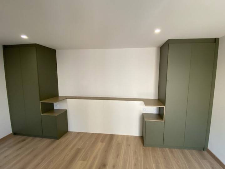 Pour optimiser l'utilisation de l'espace, nous avons incorporé deux penderies dans des placards sur mesures, pourvus de larges tiroirs. La suite parentale se transforme ainsi en un espace de nuit fonctionnel, mais également en dressing pratique.