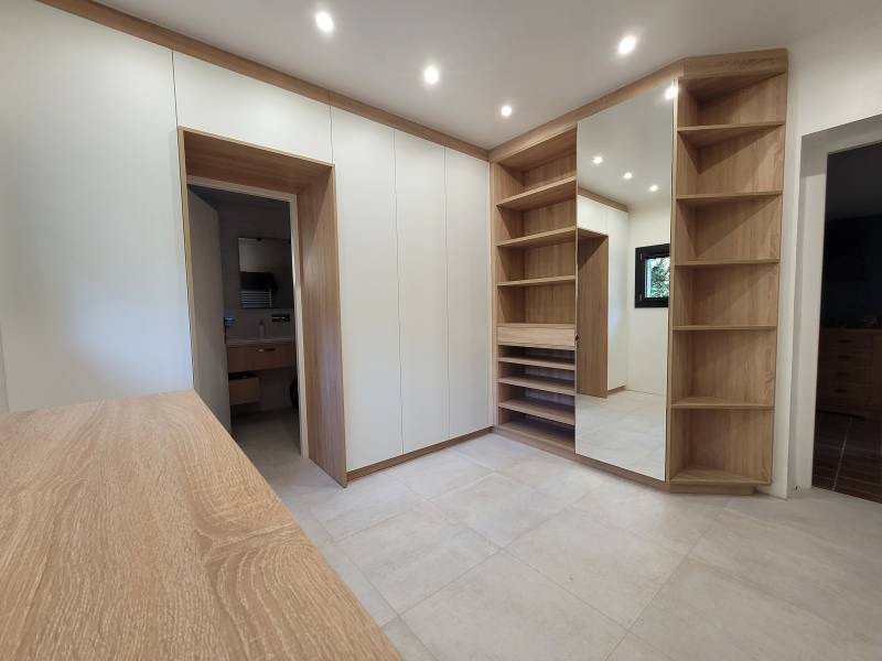 L'aménagement d'un dressing fermé avec des portes battantes, est la solution que nous avons retenu pour optimiser l'espace entre une chambre et une salle de bain. Le passage entre les deux pièces a été souligné avec le décor bois de l'encadrement.Les meubles sont équipés principalement de penderie...